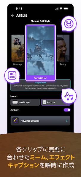 Editar instantáneamente los resaltadores en clips compartibles con AI Edit. Agregue memes, efectos de sonido (SFX), efectos visuales (VFX) y subtítulos en segundos para que su contenido se destaque.