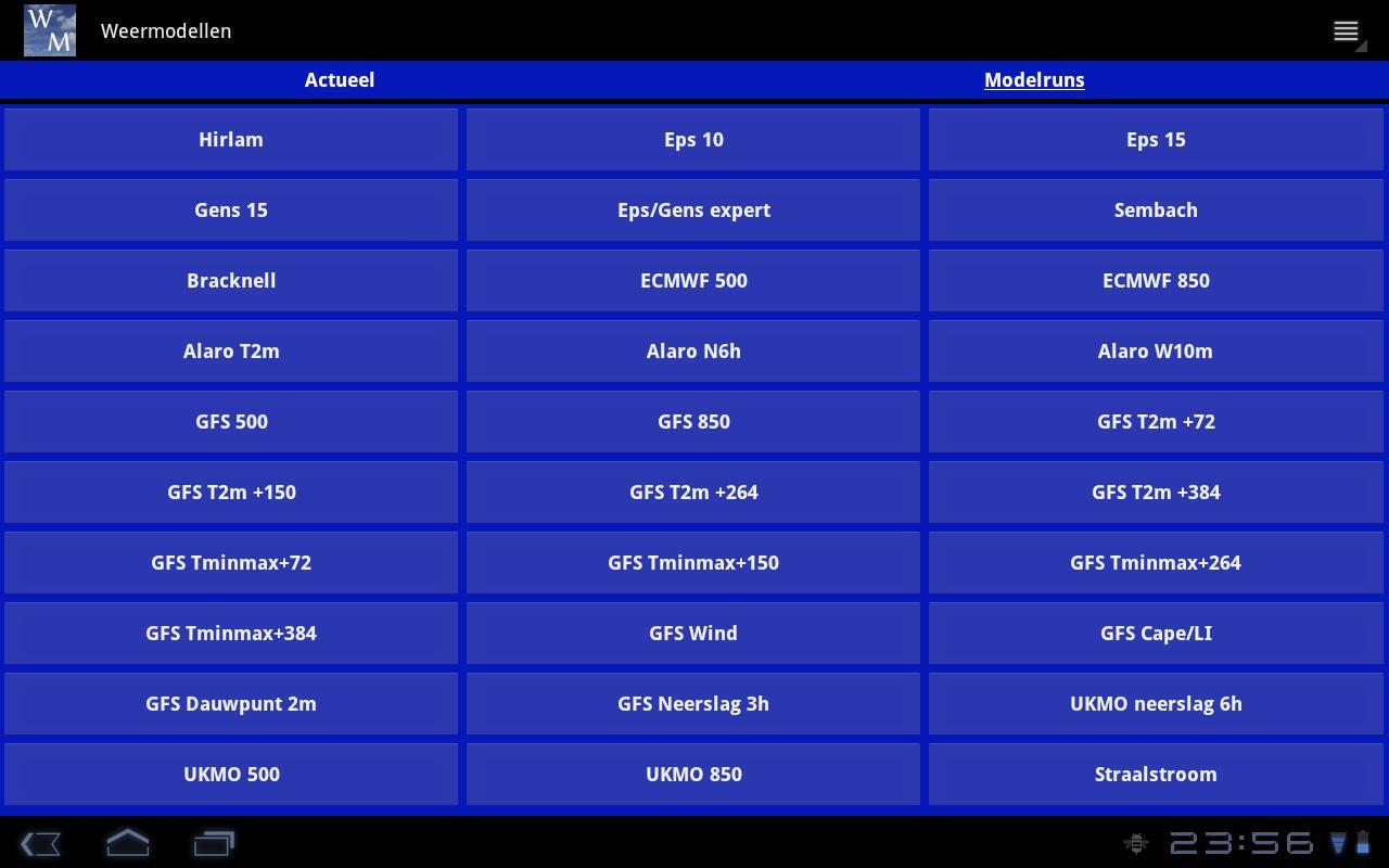 Esta es la versión Lite, adecuada para tabletas con panal. No están disponibles una serie de opciones (como SAT24, mal tiempo, extremos y ciertas ejecuciones de modelos). Todas las opciones están disponibles en la versión pagada. También hay una versión para el teléfono inteligente (Android 2.2 y superior).