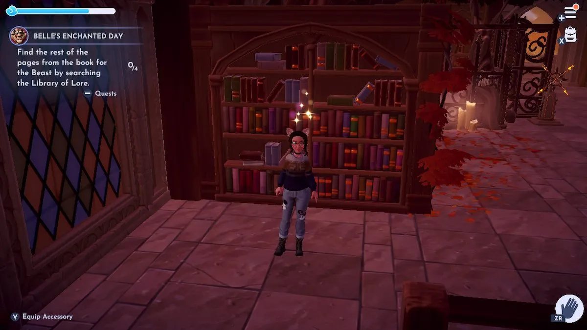 Después de hablar con la Bestia, tendrá la tarea de encontrar cuatro páginas faltantes del libro que él quiere revertir para Belle. Las cuatro páginas están en algún lugar de la Biblioteca de Lore , que es donde conociste a Mérida y al Lorekeeper.