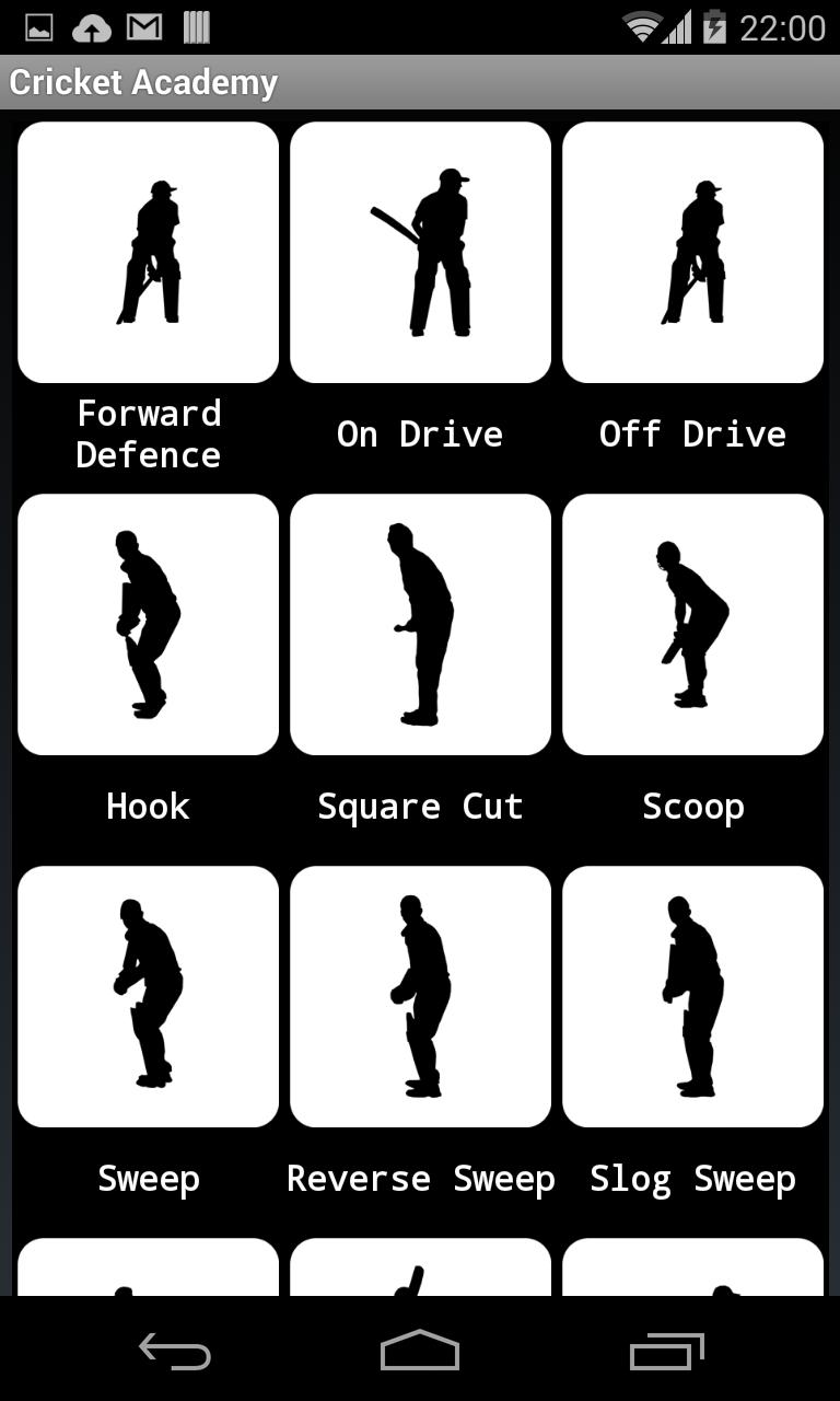 La actividad de reproducción/grabación de trazo muestra un bate virtual. Tocar el murciélago en cualquier lugar señala la preparación de los bateadores y el jugador de bolos comienza a correr. Una vez que hayas agarrado el murciélago, tome una postura de bateo adecuada. A medida que el jugador de bolos completa su carrera y entrega la pelota, escuchará un sonido de pitido (lanzamiento de la pelota). Esto es cuando juegas tu disparo. Luego escucharás un disparo, bate golpeando la pelota. En este momento debes completar tu disparo. Hay opciones de configuración que le permiten ajustar la toma de juego, tiempos de carrera según sus preferencias.