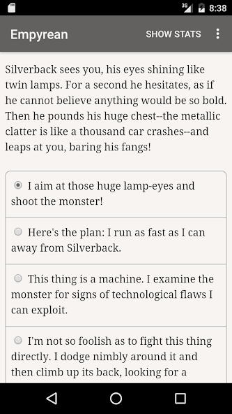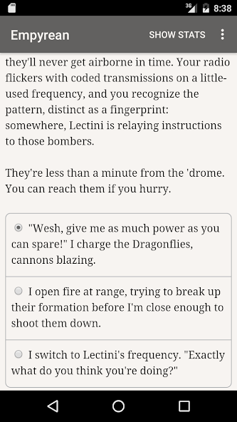 " Empyrean " is an interactive "flying ace" novel by Kyle Marquis where your choices control the story. Está completamente basado en texto, 325,000 palabras, sin gráficos o efectos de sonido) y alimentado por el vasto e imparable poder de su imaginación.