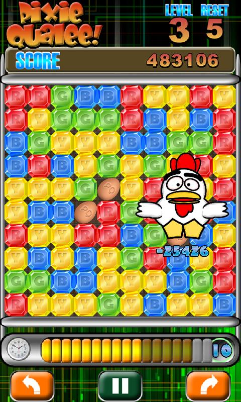 ¡Peligro! Si toca menos de tres gemas, un pollo totalmente loco y asustado reemplazará esas gemas por huevos y perderá el 5% de su precioso puntaje. Estos huevos son realmente una molestia, pero puedes vincular tres o más de ellos para eliminarlos.