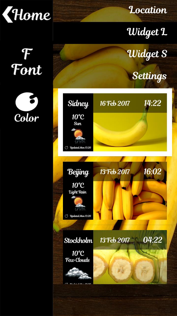 Il est très utile lorsque vous avez une prévision du bout des doigts et lorsque vous pouvez vérifier la température immédiatement. Grâce au dernier Banana Weather Widget ♦ Vous n'aurez pas à perdre de temps et à rechercher sur Internet afin que vous puissiez voir à quoi il ressemble. Déverrouillez simplement votre appareil et vous trouverez tout ce que vous devez savoir. Ce widget supérieur vous montrera également l'heure et la date, donc c'est tout ce dont vous avez besoin sur votre écran d'accueil et il lui donnera également un tout nouveau look. Vous sourirez chaque fois que vous voyez de délicieuses bananes et elles vous inspireront à manger plus sainement. Une autre chose que cool ♦ Banana Weather Widget ♦ vous montrera, ce sont les conditions météorologiques. Vous saurez s'il pleut parce qu'une icône sur le côté gauche du widget changera en nuage avec des gouttes de pluie; Alors que dans le cas où le ciel serait clair, vous verrez le soleil.