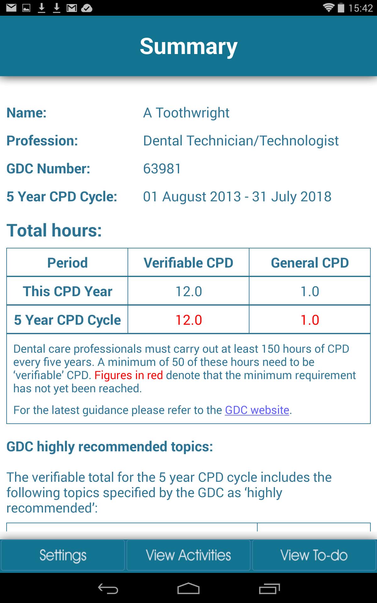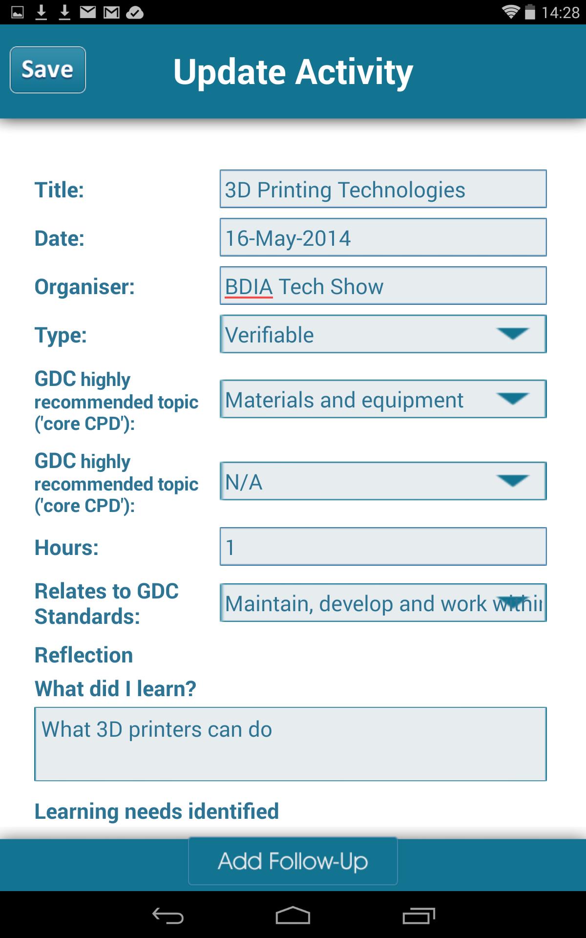 Enregistrez toutes vos activités de développement professionnel dans le module CPD. Les catégories en vérifiables ou généraux ainsi que les sujets fortement recommandés et recommandés du Conseil dentaire général. Voir en un coup d'œil vos résumés annuels et cinq ans du cycle et faites la soumission de votre retour annuel avec le General Dental Council un jeu d'enfant. Réfléchissez à ce que vous avez appris et définissez des activités de suivi qui sont entrées dans votre calendrier. Voir en un coup d'œil vos activités enregistrées et de suivi.