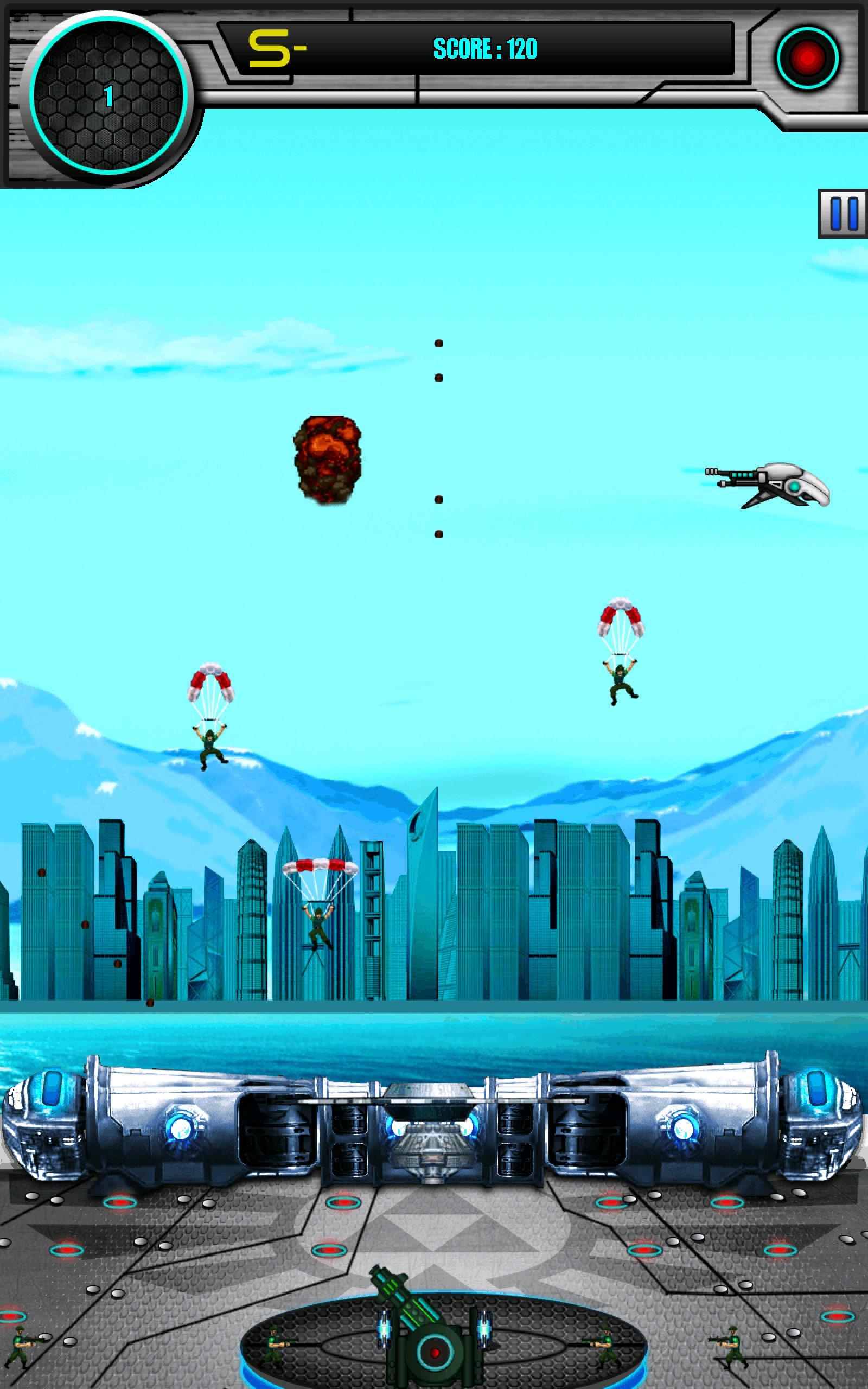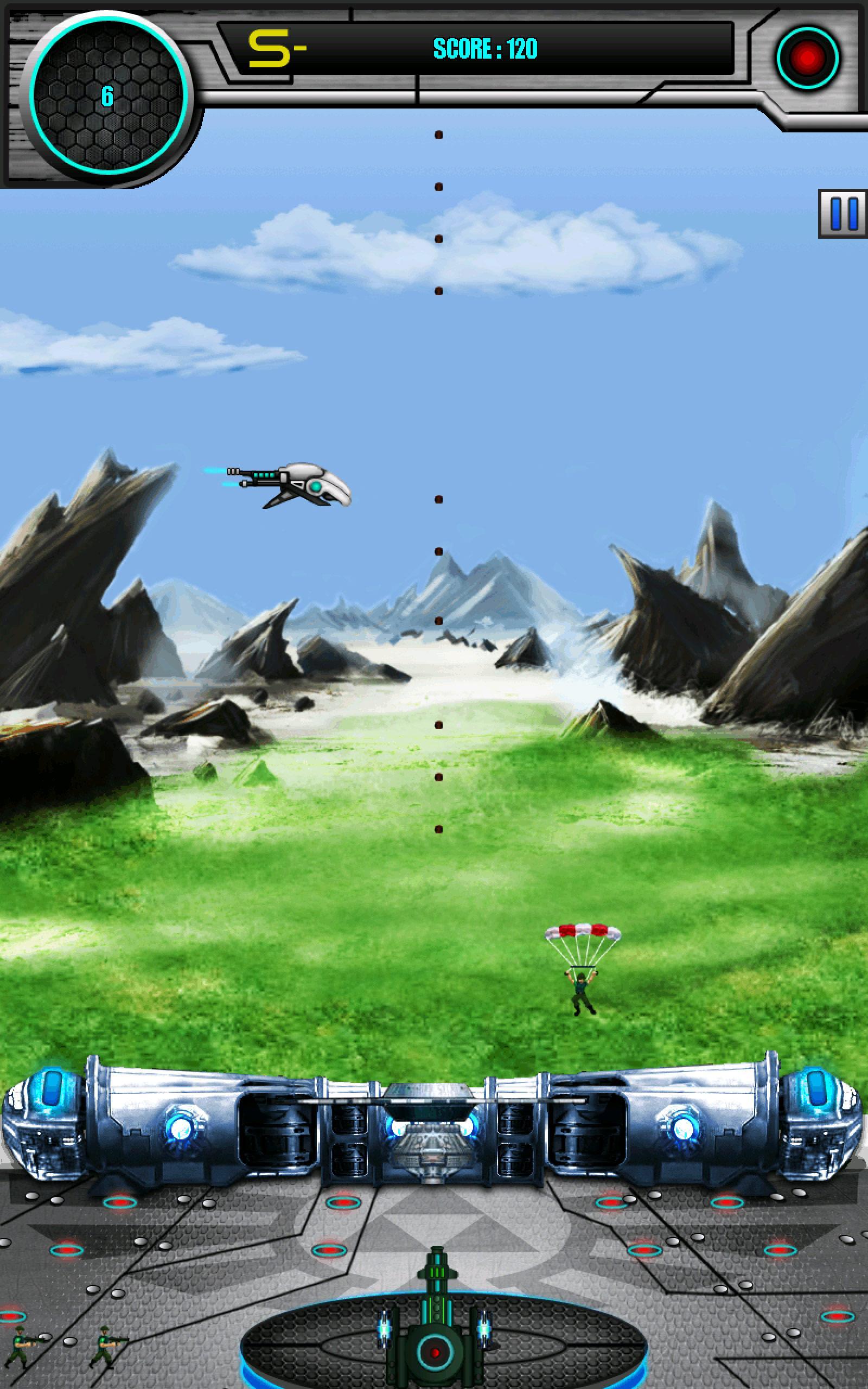 Utilisez le réservoir et abaissez les parasoldiers envahisseurs, les pillards aériens, les bombardiers à plasma et les bombes à plasma. Le jeu se termine si 4 parasoldiers atterrissent de chaque côté du canon ou si le canon est bombardé par les bombardiers.