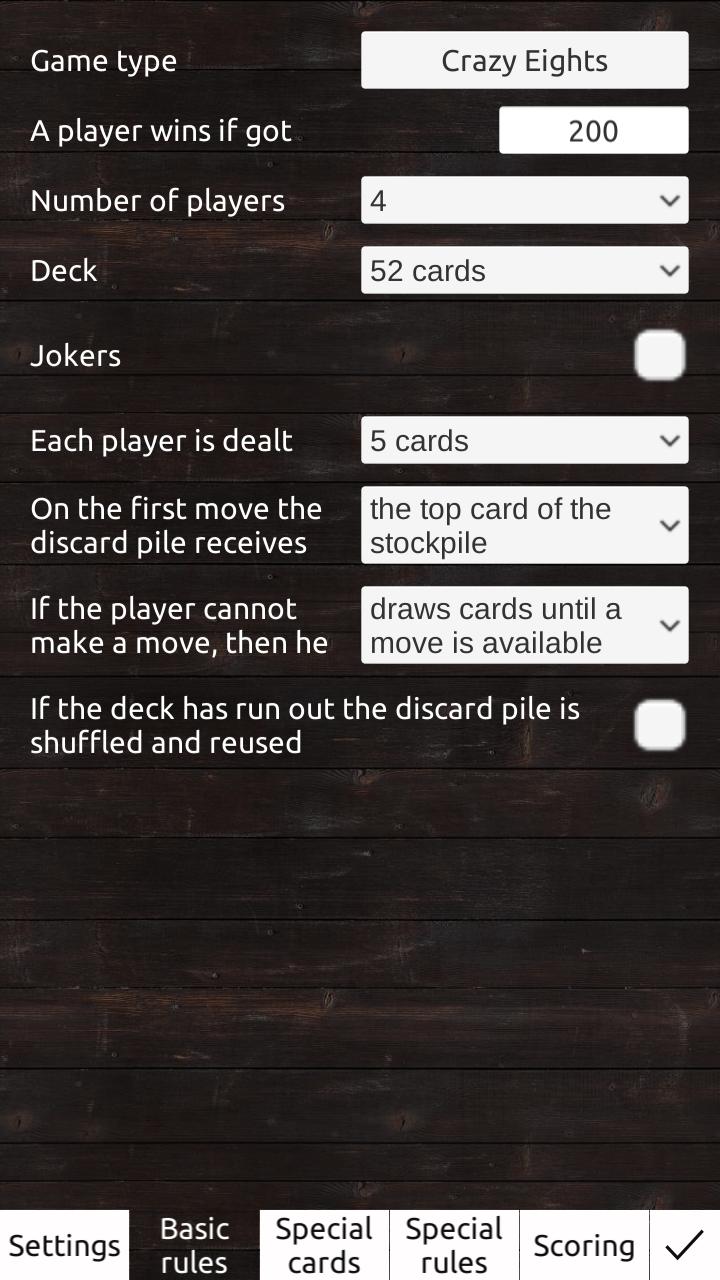 Crazy Eights est un jeu de cartes de type défilé pour deux à sept joueurs. L'objet du jeu est d'être le premier à se débarrasser de toutes les cartes du joueur à une pile de défausse. Il existe de nombreuses variantes du jeu de base, et un certain nombre de noms différents, y compris des craints, le dernier, Mau-MaU, Pesten, Rockaway, Swedish Rummy, Switch, Last Card, Vis votre voisin, Püskiyon et Tschausepp. Vous pouvez jouer à la plupart de ces jeux.