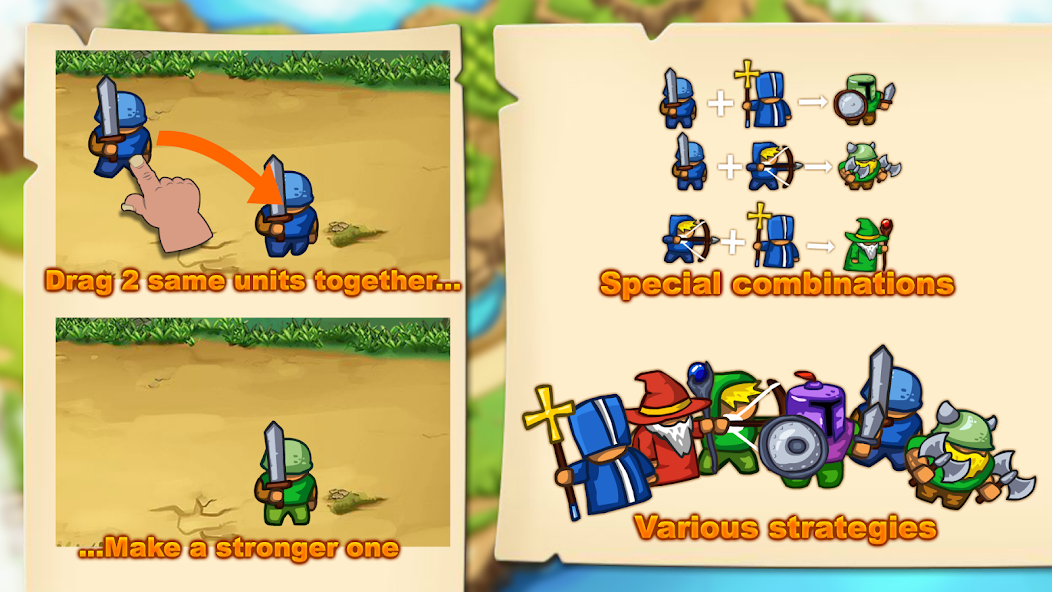 Des unités de base Sword Man le guerrier de mêlée, archer le guerrier à distance, prêtre le guérisseur, vous pouvez les combiner pour créer une axe man, tank, mage.