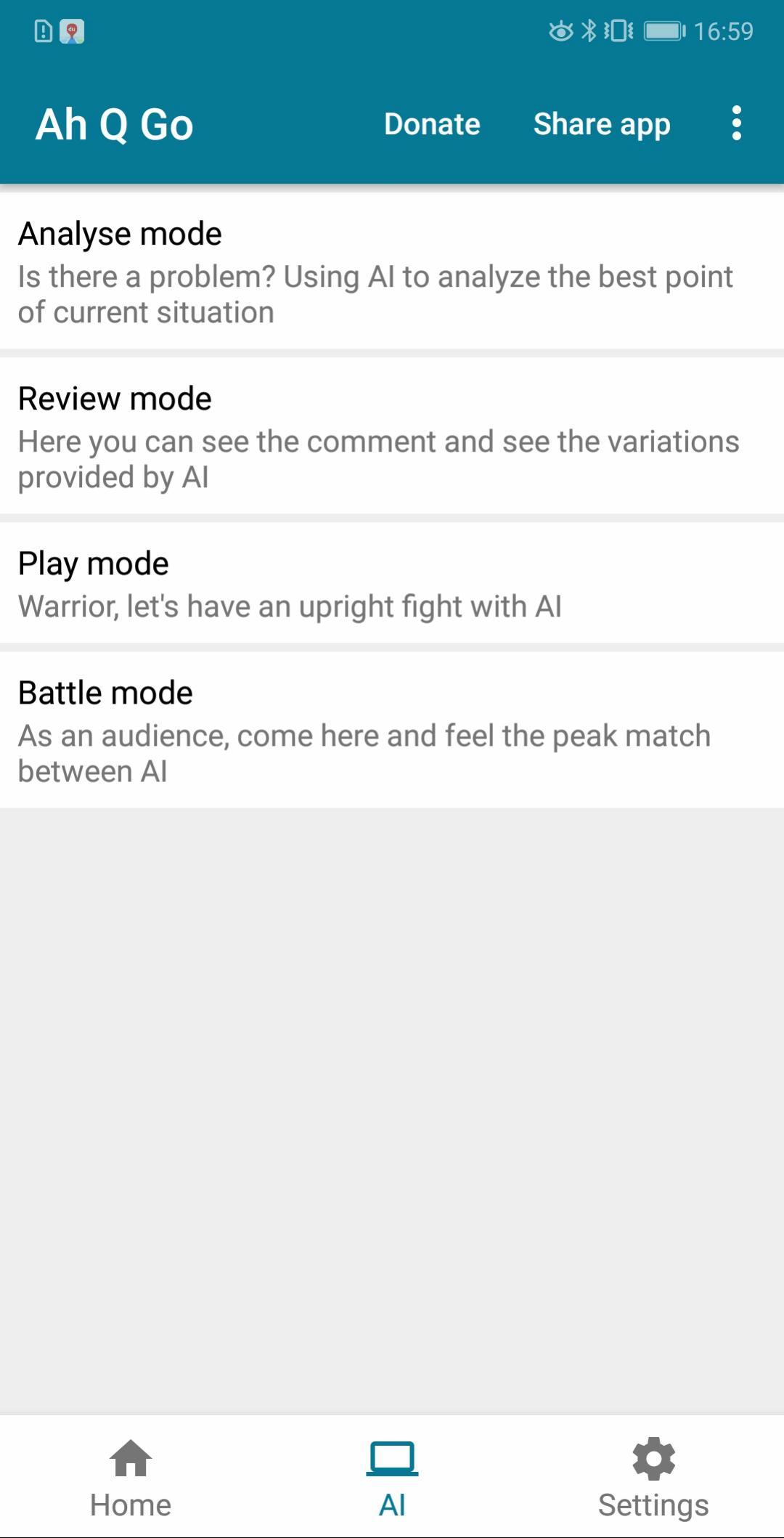 You can use Analyse/Review mode to review your games, or use play mode to play game with AI, or even use the battle mode to let two AIs play.
