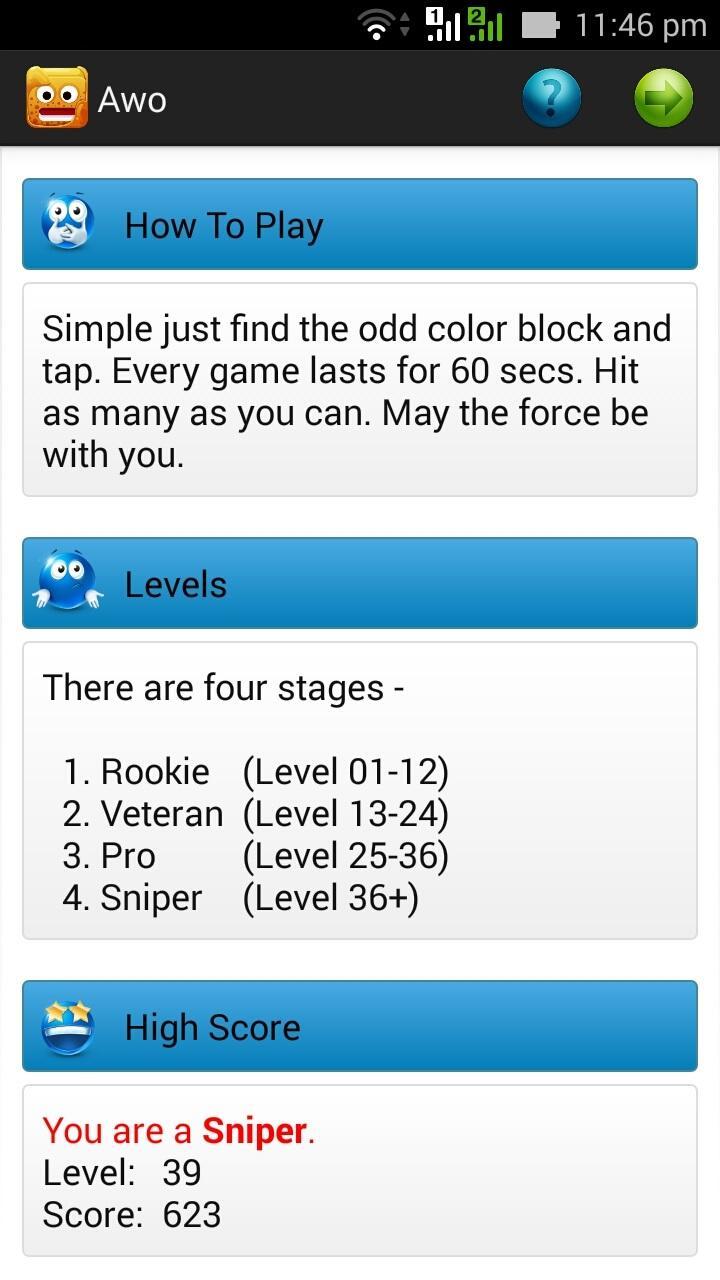 In this game a player has to find the one cell which is having a different color than the rest of the cells. Each game lasts for sixty seconds. Aim is to clear as many levels as possible.