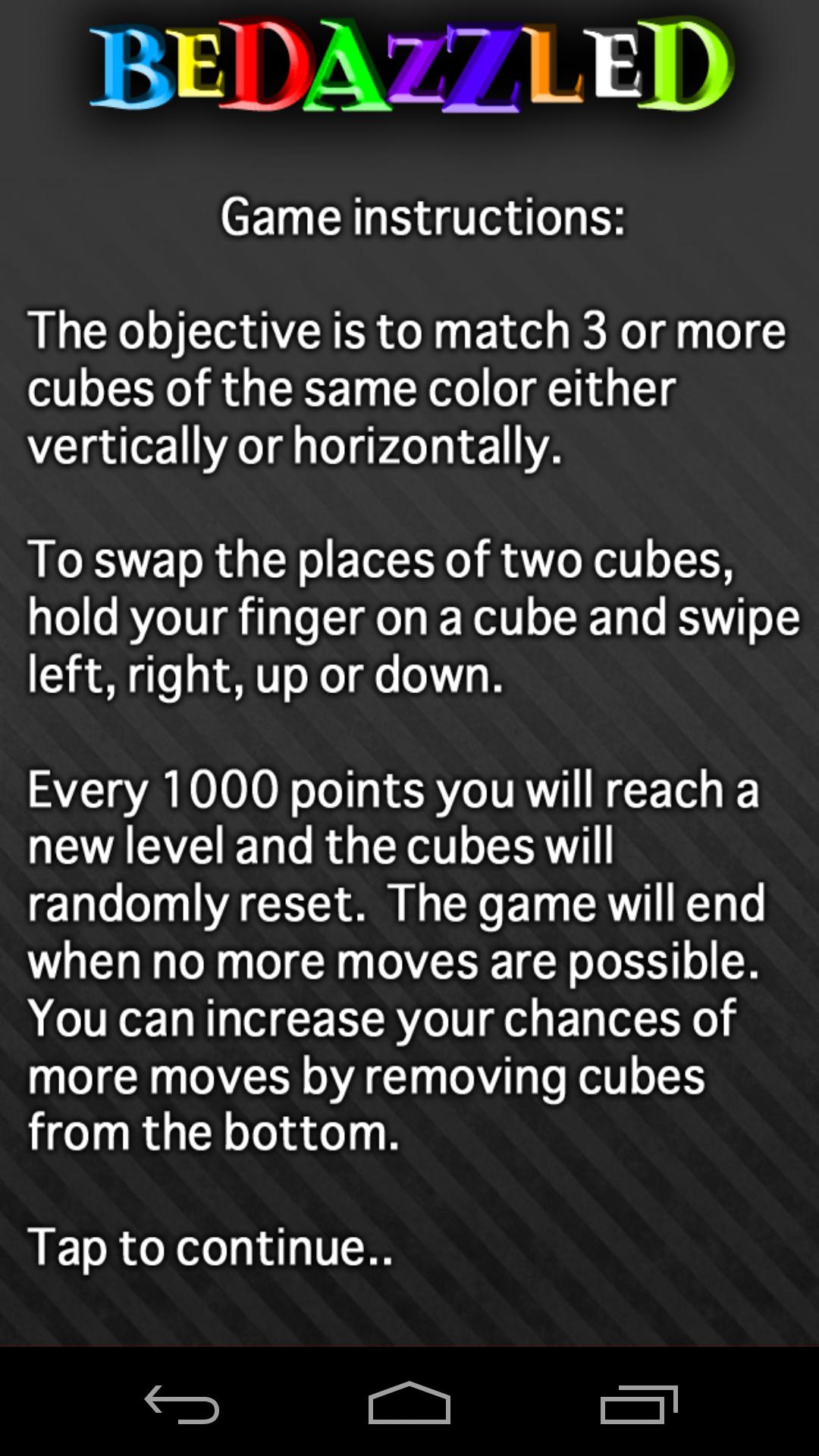 Match 3 or more numbers in a row or column. To swap blocks, swipe a block left, right, up or down. The higher the numbers you eliminate, the more points you get! Reach 1000 points to clear the level and advance to the next board. The game will end when there are no more moves. It will tell you this so you aren't trying to find a match when there are none possible.