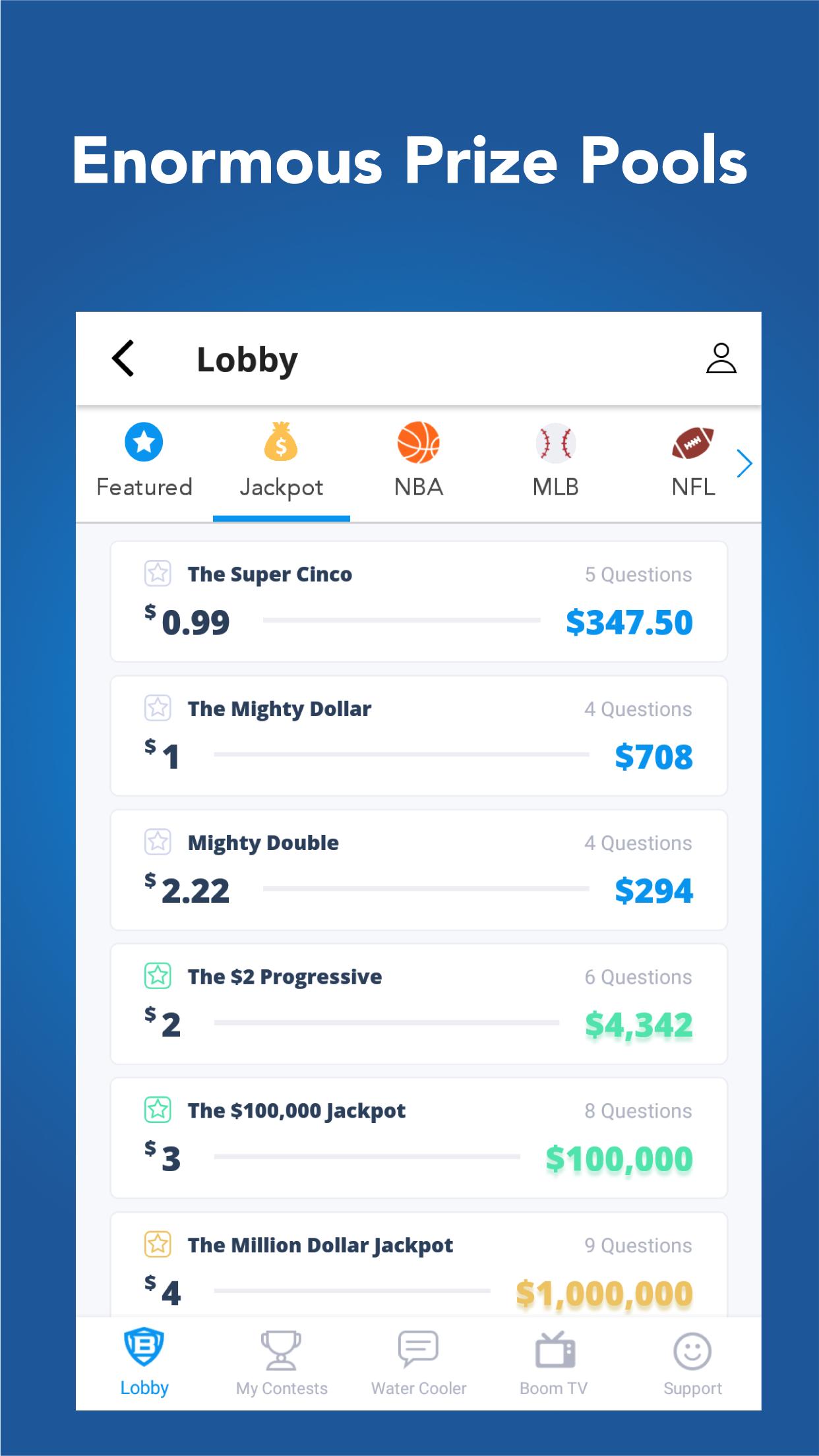Boom Fantasy is the world’s No. 1 pick'em and jackpot fantasy sports destination. While other daily fantasy sports sites cater to the sharks, Boom Fantasy gives real sport fans the opportunity to win huge cash prizes.