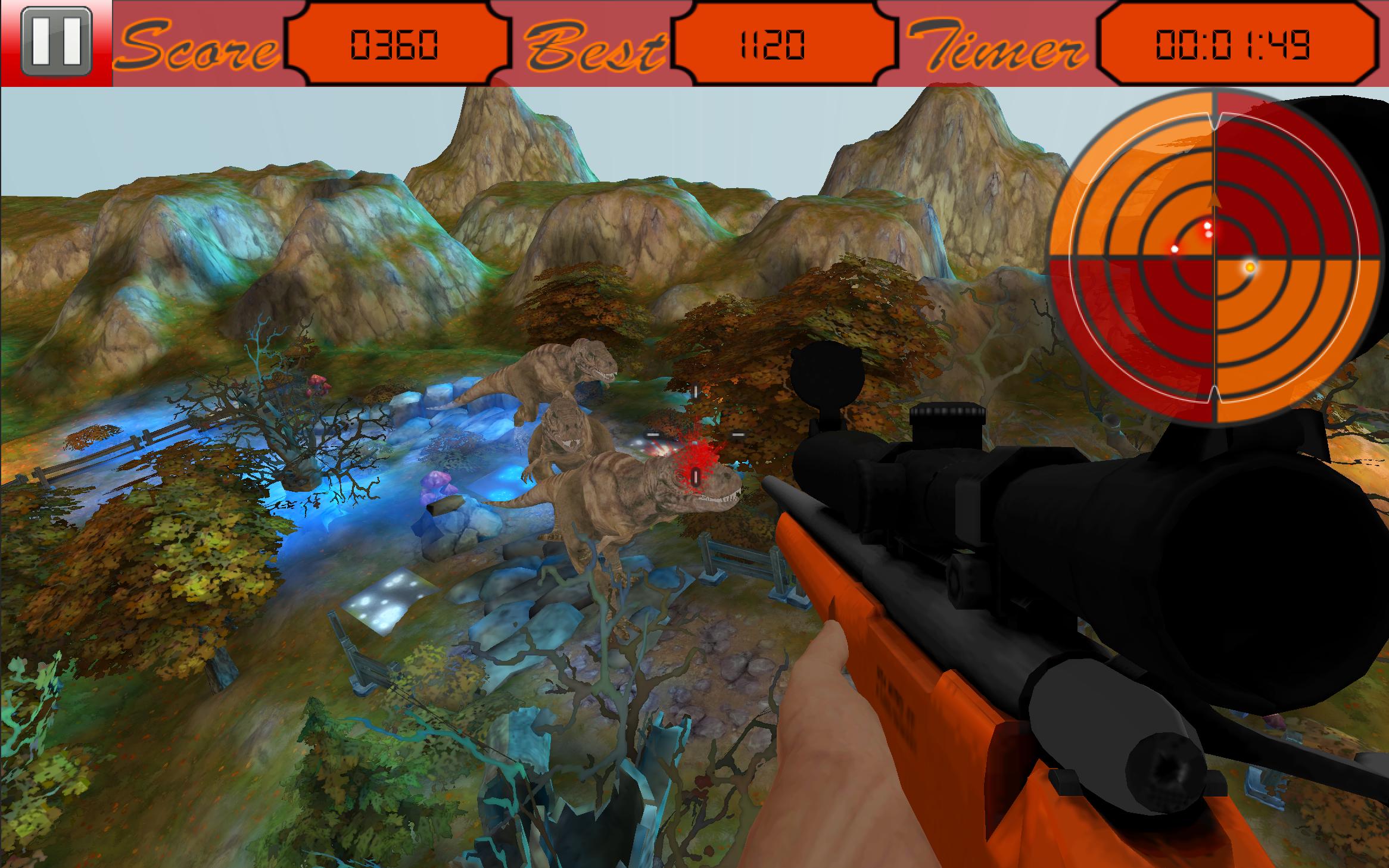 Dinosaur Sniper Hunter is an amazing first person shooter game. Dinosaur Sniper Hunter includes deadly carnivores that are trying to attack on a village. You are sitting in a secret high spot inside the forest and your mission is to defend the villagers and defeat the attackers. Dinosaur Sniper Hunter provides you an excellent fantasy forest environment to enjoy. In order to kill the attacker you need a single hit on head, or three hits on their body. Start shooting in Dinosaur Sniper Hunter, your mission is to keep the attackers away from the villagers for a specific time frame till a rescue team reaches there. The humans inside the village must survive in order to win the game. Dinosaur Sniper Hunter game comes with three interesting levels. Download the game and enjoy defeating the attacking species.