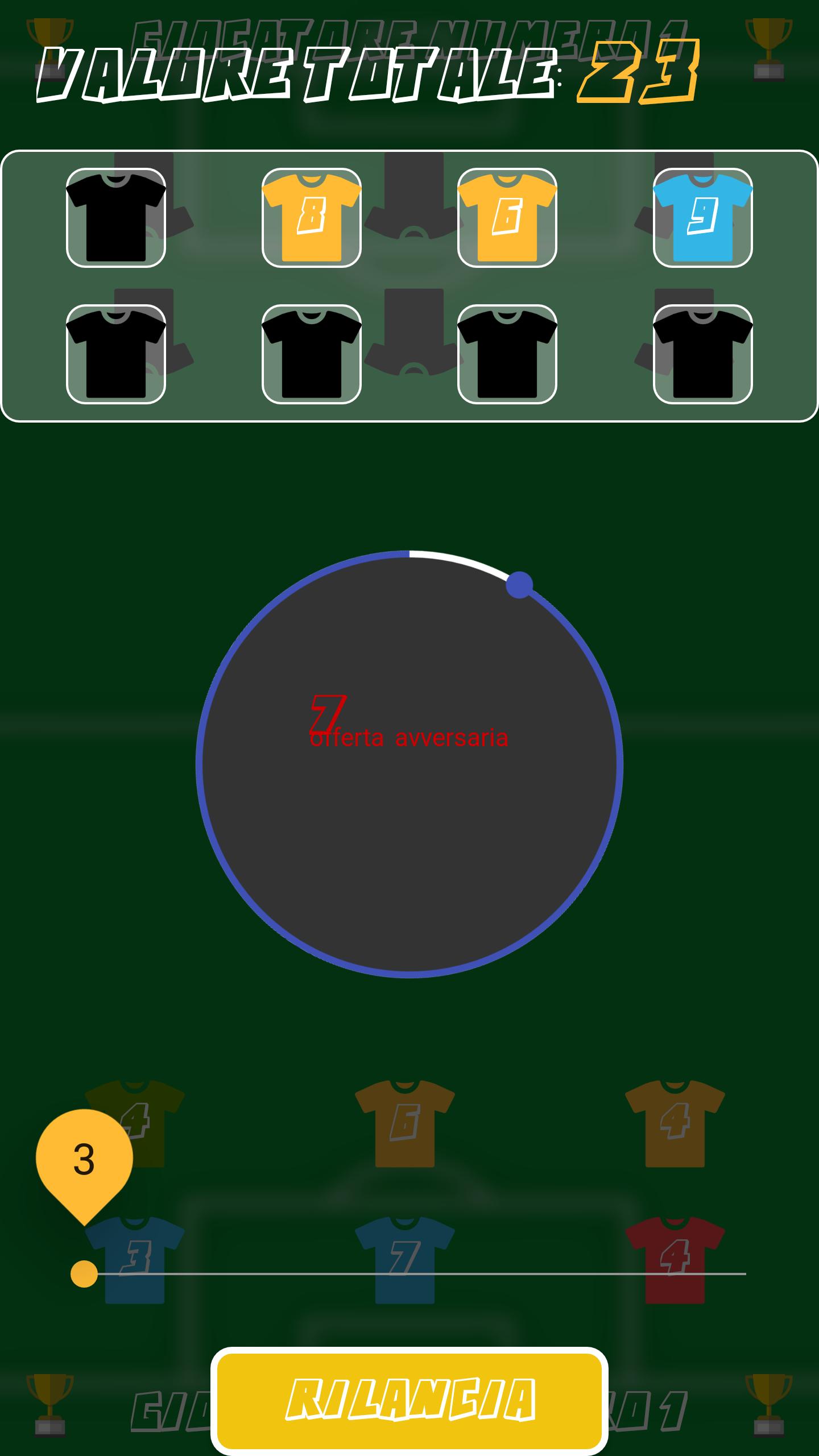 Choose the players to put on the plate for each auction, your opponent will do the same. He studies well how many goalkeepers, defenders, midfielders or attackers insert in every lot who will be proposed to the fantasy market by paying close attention to the vote shown on the players' shirt: it will be the sum of these votes to make you win or lose the game.