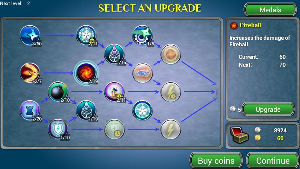 Spend the coins between missions to upgrade weapons and protection of the castle, and to improve special weapons as well!