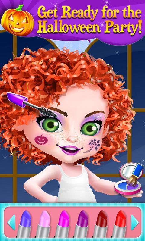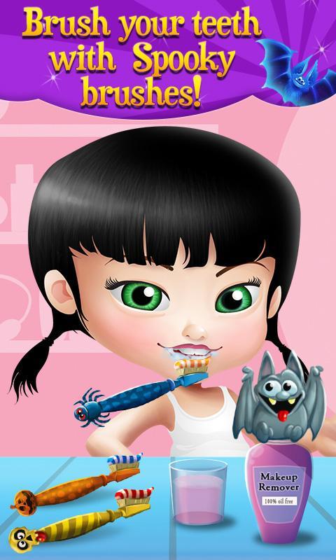 In order to try on a costume, you need to look the part first! Stop by the spa / salon for a Halloween makeover and take all the time you need to pamper yourself and maybe even look a little spooky for the party! Start with a hairbrush and tweezers, and then you can wash and blow dry your hair like a real salon! Don’t forget to brush her teeth with the spooky toothbrushes! In this app, your makeup and beauty tools are even customized for Halloween! Decorate yourself in pumpkin themed face cream, or a bat eye mask, even a spooky makeup remover!