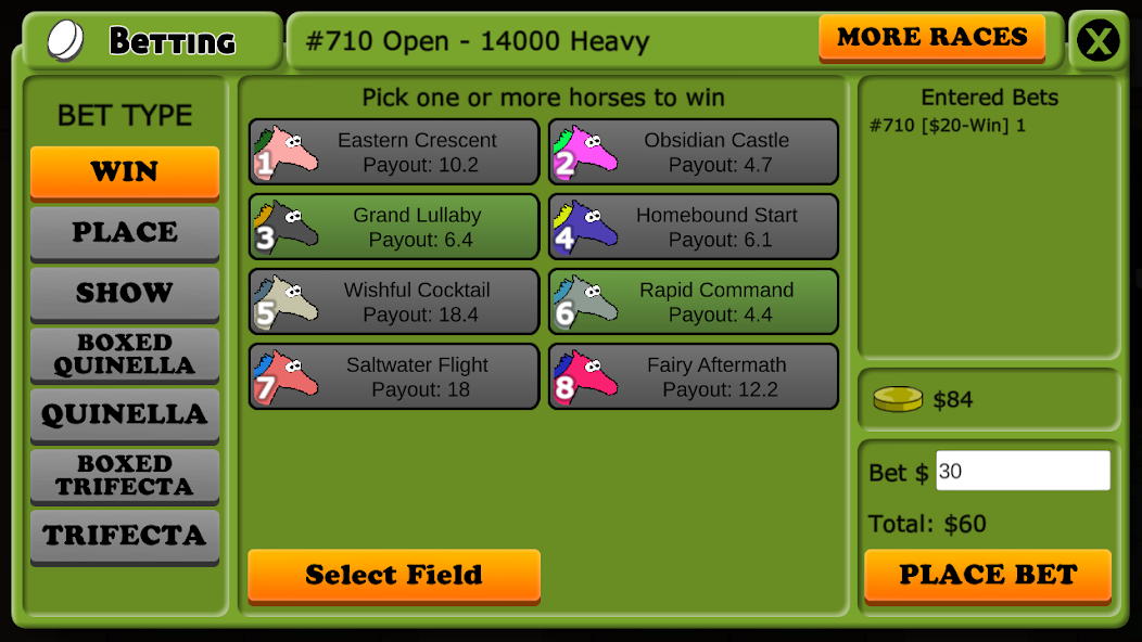 Place your bets, enter your horses and sit back to watch the races run in real time.