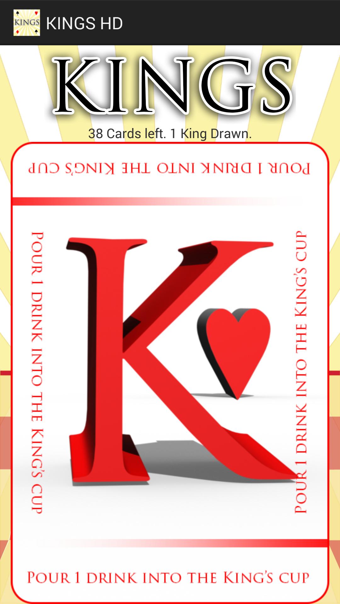 Grab your friends, this FREE android app, a cup, and your drinks. Just swipe the deck of cards to draw a card, tap the deck to buzz someone out, and follow the rules on the selected card. All cards are marked with standard rules to help assist players. Most people sit around a table and take turns drawing a card. For each king drawn, a small amount of the players drink is poured into the kings cup. The goal of the game is to not draw the last king, as the unlucky player who draws the last king, drinks the kings cup.