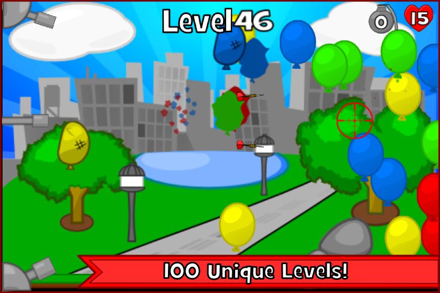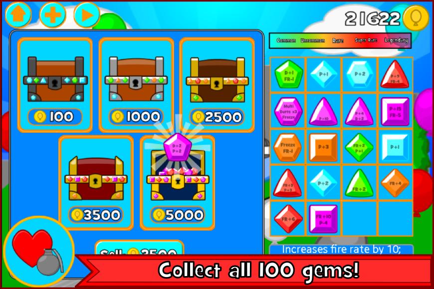 Shoot darts at waves of balloons to pop them before they sneak past you! Play in either the 100 levels in Classic Mode or test your limits in Endless Mode. Power up your darts using 100 different powerful gems each granting different powers and abilities. If you find yourself in a sticky situation, throw a dart grenade which will send darts flying out in all directions. Keep track of all the gems you are able to get your hands on with the Gem Library and try to collect them all!