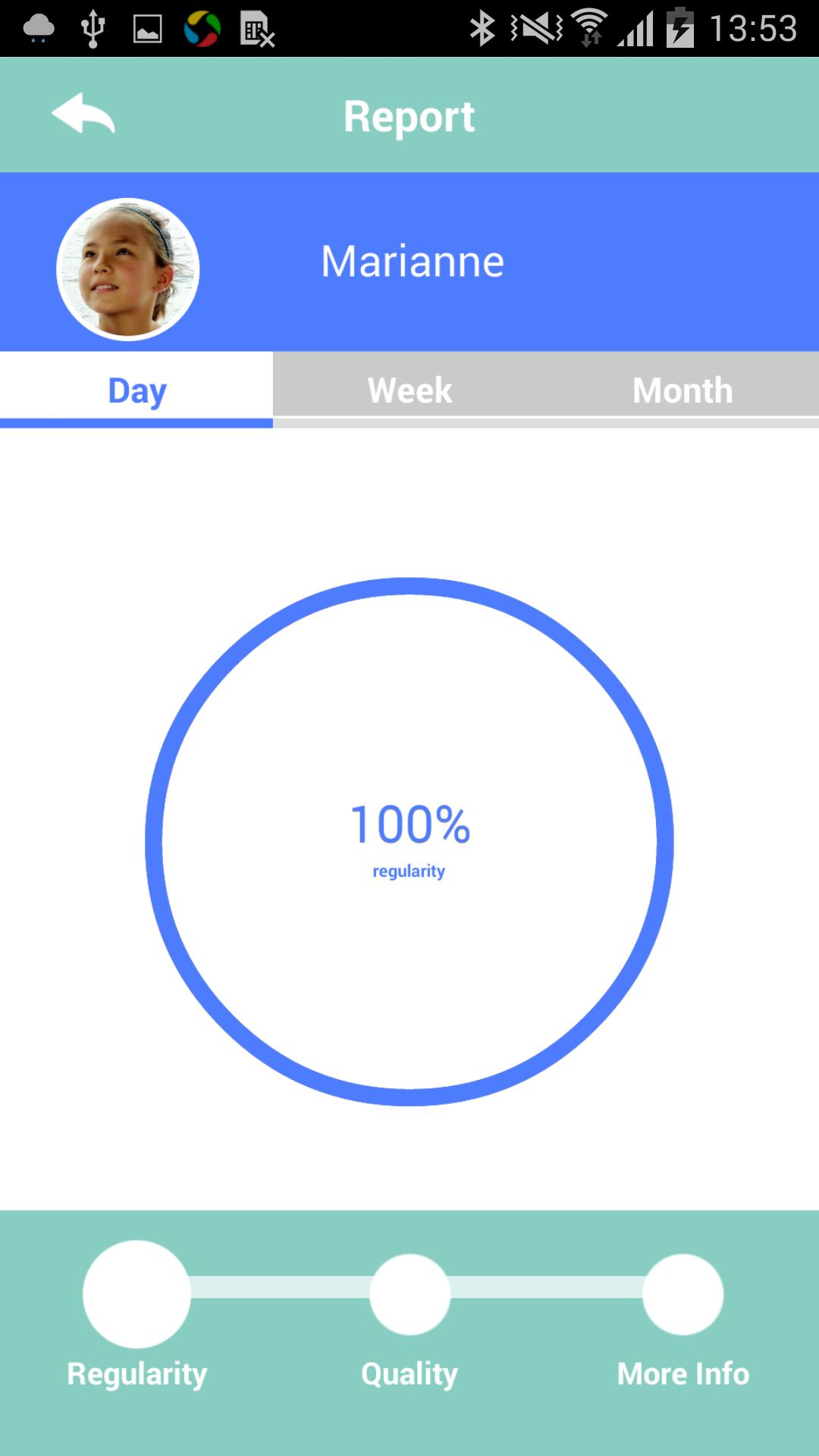 Using Bluetooth, it connects to smart phone and to the Rainbow Junior App that analyzes the quality and regularity