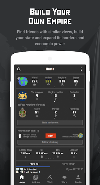 You will take part in air, land, sea and space wars, create your own newspapers and publish articles, use real world regions to form your own state and choose its form of government: dictatorship or presidential republic? It's your choice!