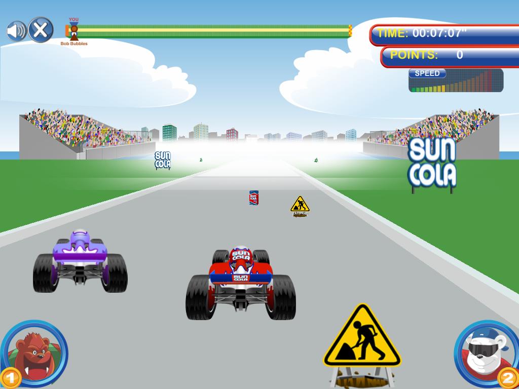 Join Mr. Suncola for a Formula 1 race and compete with Mr. Bubbles about reaching the finish line first.