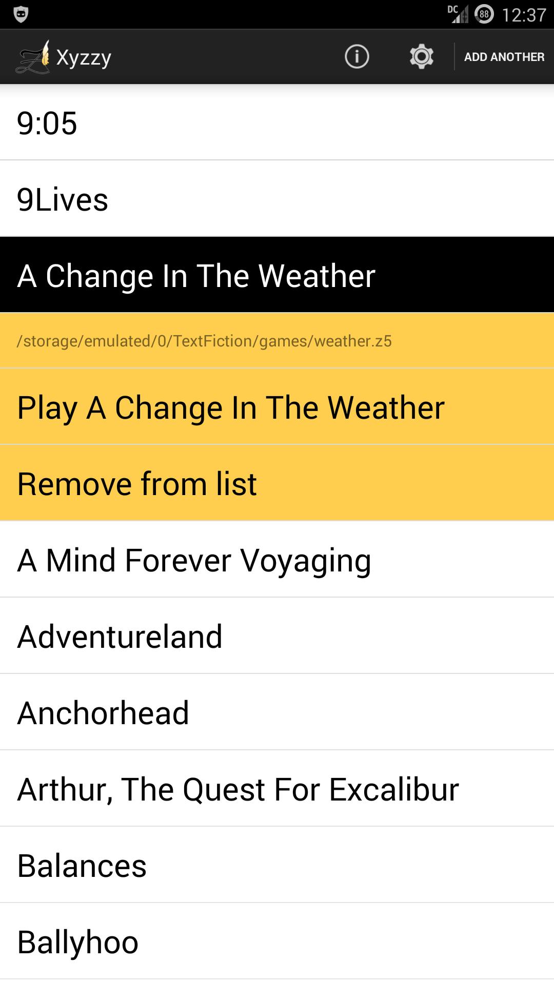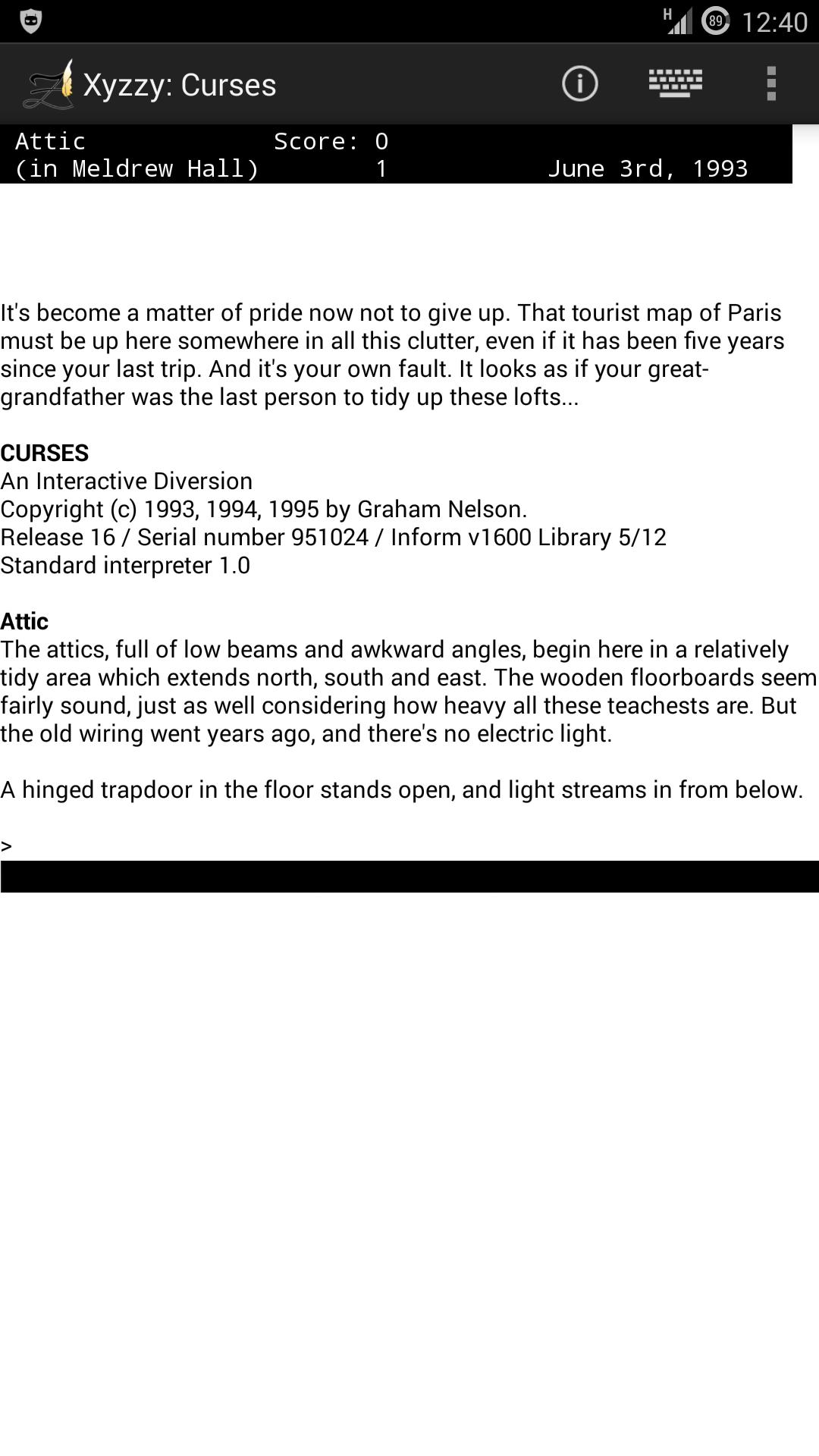 Xyzzy is a ZCode interpreter for Android, able to play both classic Infocom text adventures and modern, Inform-compiled interactive fiction. In comparison to other zcode interpreters on the android market, it has the following advantages:
