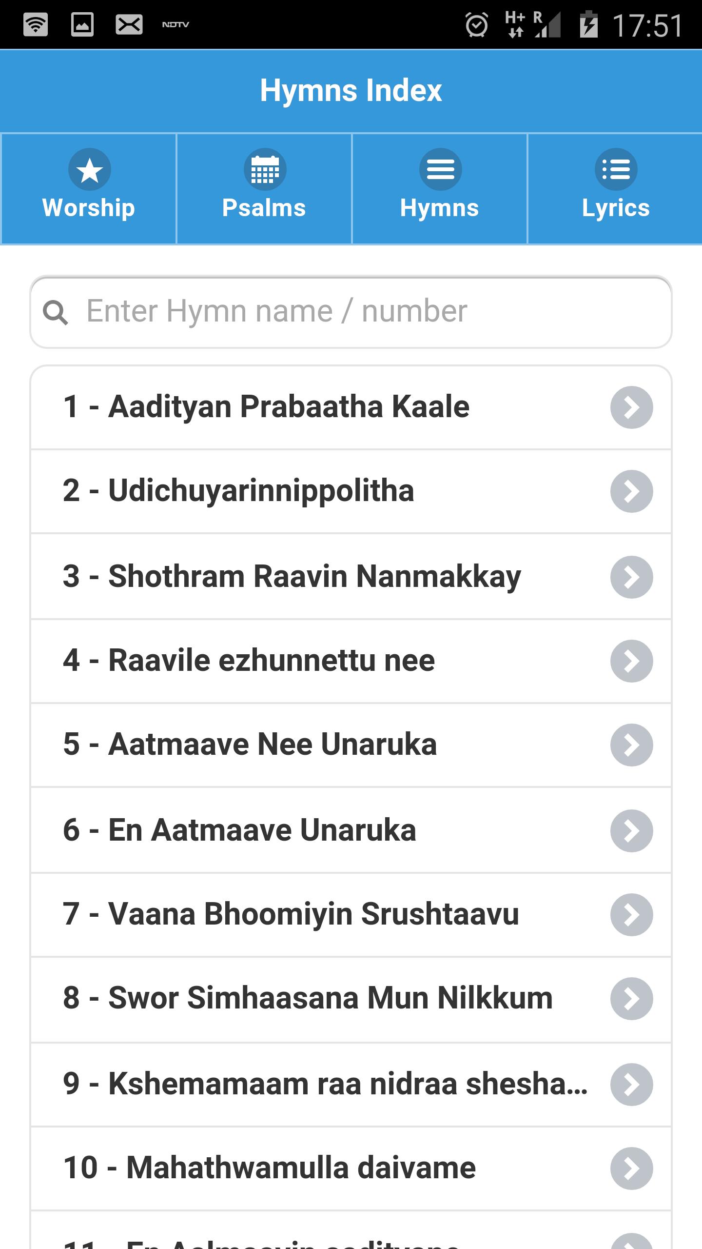 Aplikasi ini untuk Layanan Ibadah Gereja Malayalam CSI dan berisi dua perintah pelayanan, sebagian besar mazmur (kecuali sedikit antara 70 dan 95), semua nyanyian pujian dan semua lirik.