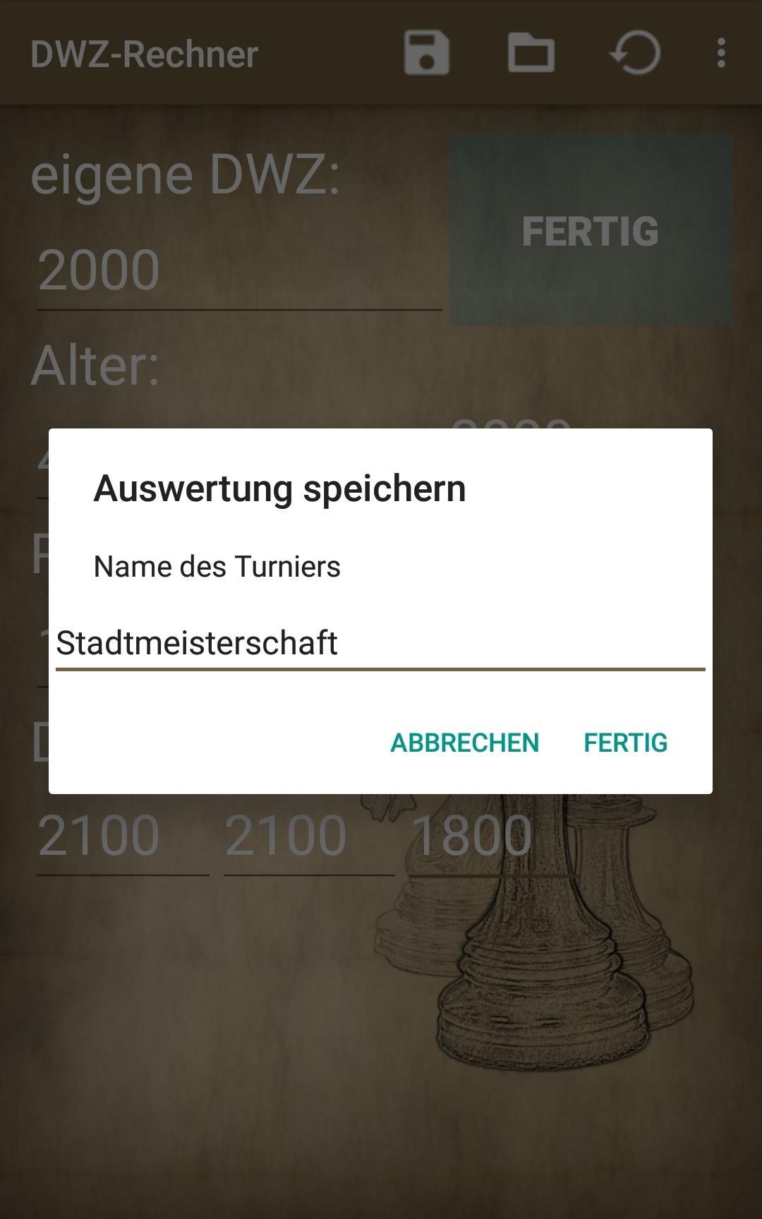DWZ-Rechner yang mudah digunakan, adalah aplikasi optimal untuk menentukan kekuatan keterampilan dalam olahraga catur. Bahkan selama turnamen, Anda dapat menggunakan aplikasi ini untuk menghitung perubahan DWZ Anda. Tentu saja, Anda juga dapat menyimpan perhitungan dan melihat dan mengedit lagi di kemudian hari.