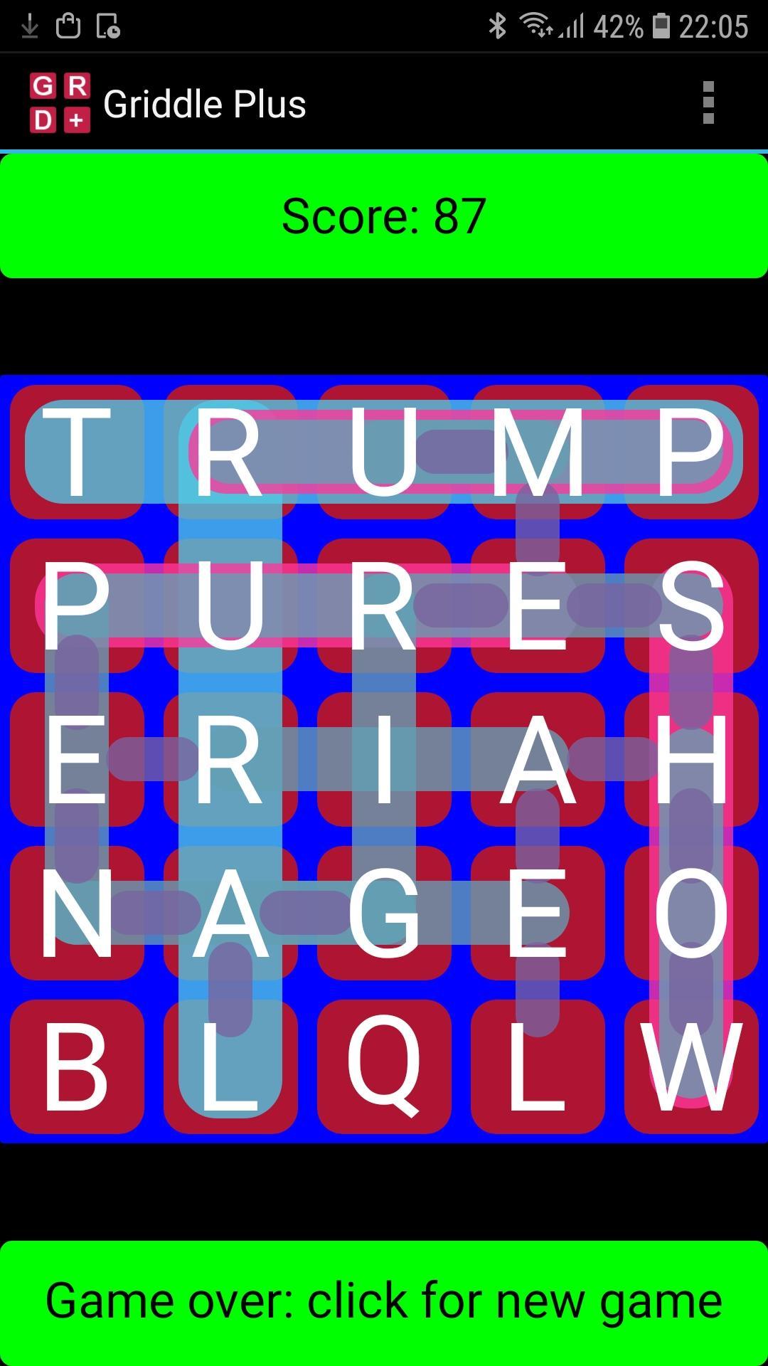 Griddle:このシンプルだが中毒性のあるワードゲームは、スキルと運のバランスをとることができます。グリッドに戦略的に配置する必要がある特別に設計された74レターカードデッキから、25枚のカードがお客様に配られます。