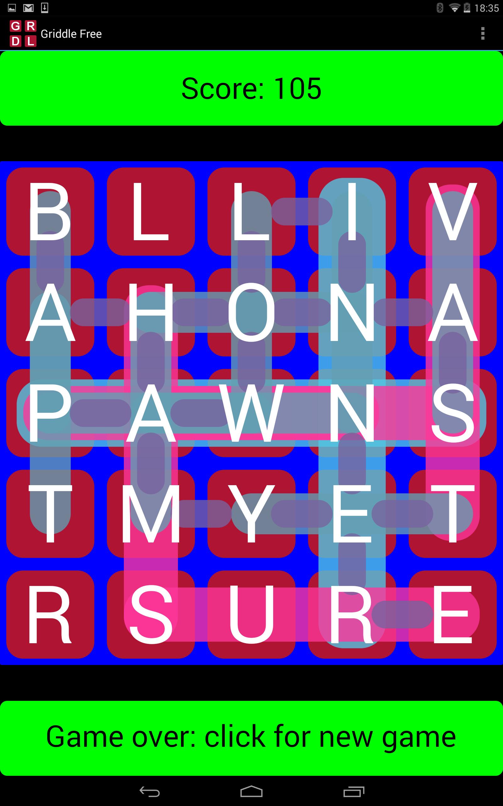 垂直と水平の単語のみが許可されていますが、サブワード(単語内)がカウントされるため、その中に多くの短い単語がある5文字の単語を作成してみてください。統合されたスクラブルスタイルの辞書に対して単語がチェックされます。珍しい言葉がいくつ存在するかに驚くかもしれません!