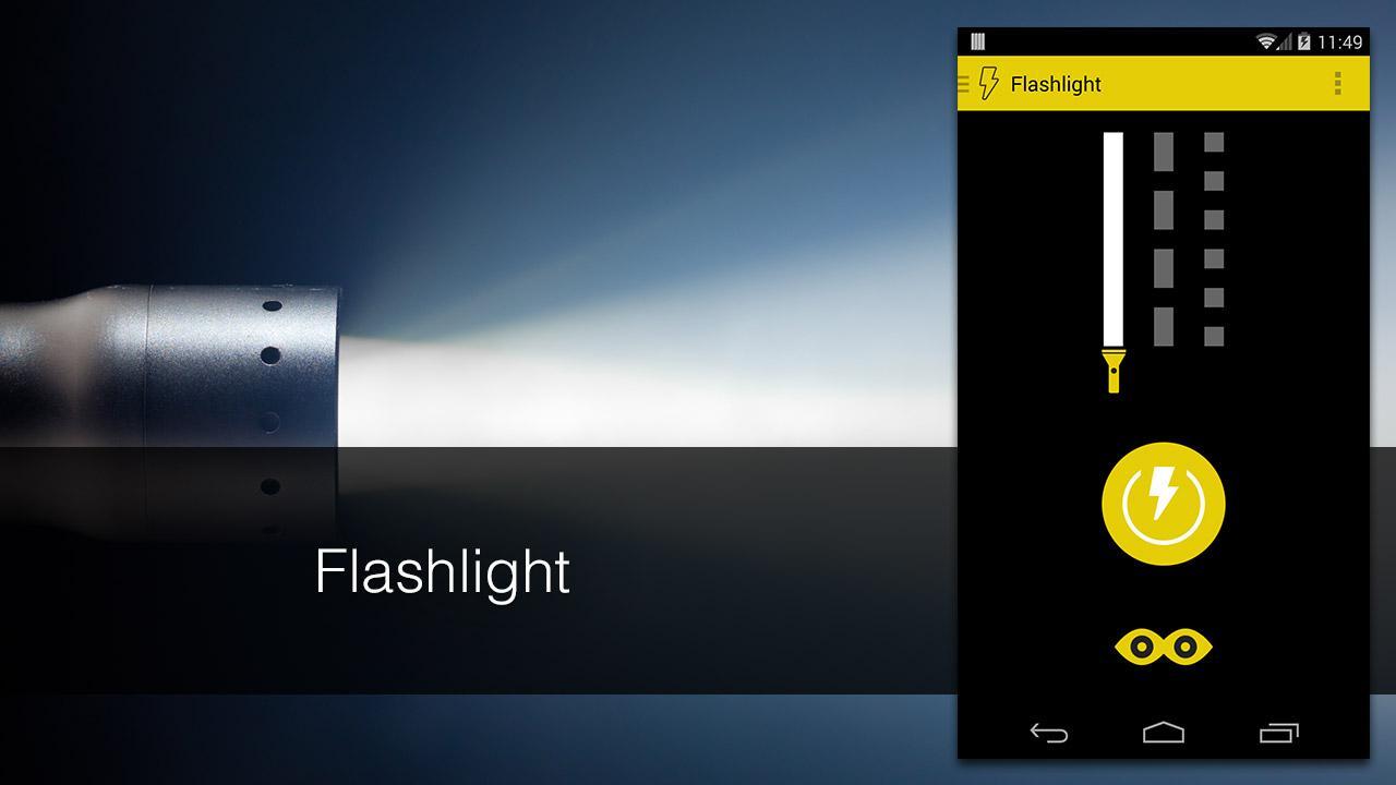 - 손전등 : 스트림, 스트로브 및 빠른 스트로브 모드가 포함 된 초조한 손전등. 편리한 "보기"기능을 사용하면 손전등이 켜져있는 동안 카메라 렌즈를 살펴볼 수 있습니다. 희미하게 조명 된 레스토랑에서 메뉴에 적합하거나 어둠 속에서 열쇠 홀을 찾습니다.
