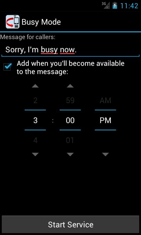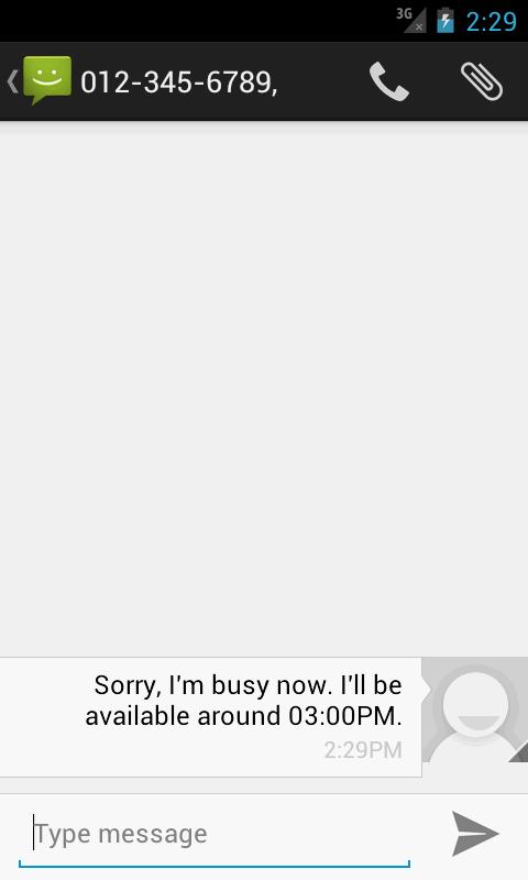 운전하거나 회의에있을 때는 휴대 전화를 Busy Mode 로 돌려 모든 전화를 차단하고 발신자에게 자동으로 문자 메시지를 보냅니다.