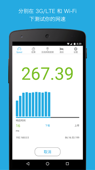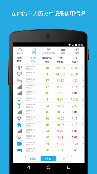 ✓ 개인 결과 기록에서 인터넷 속도 테스트를 추적하십시오. 다운로드 및 업로드 속도, 핑, 신호 강도, 네트워크 이름, 내부 및 외부 IP 및 테스트 날짜가 포함됩니다.