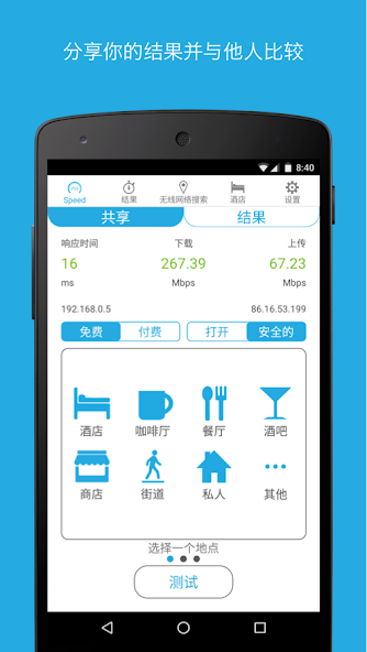 ✓ Crowdsourced Wi-Fi Finder 데이터베이스에 테스트 결과를 기여하여 빠른 네트워크 연결이 가능한 무료 WiFi 핫스팟을 찾는 데 도움이됩니다.