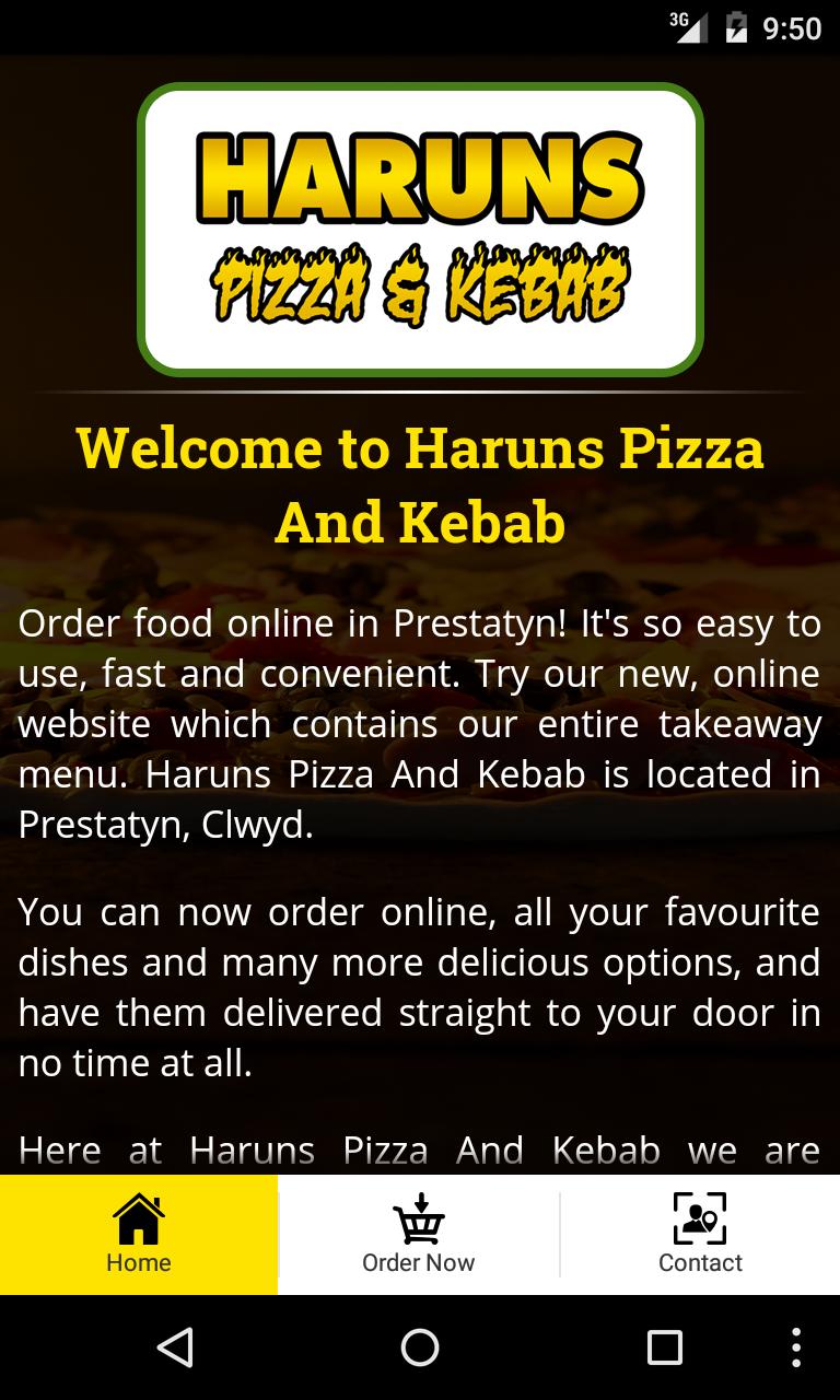 Encomende comida online em Prestatyn! É tão fácil de usar, rápido e conveniente. Experimente nosso novo aplicativo on -line, que contém todo o menu de take -away. Haruns Pizza And Kebab estão localizados em Prestatyn, Clwyd.