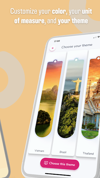 O aplicativo é personalizável com várias opções de fundo e unidade (Celsius ou Fahrenheit) para permitir que você adapte a tela às suas preferências. Ele se adapta a todos os tipos de telefones e tablets e é traduzido para o seu idioma para uma experiência única e confortável do usuário.