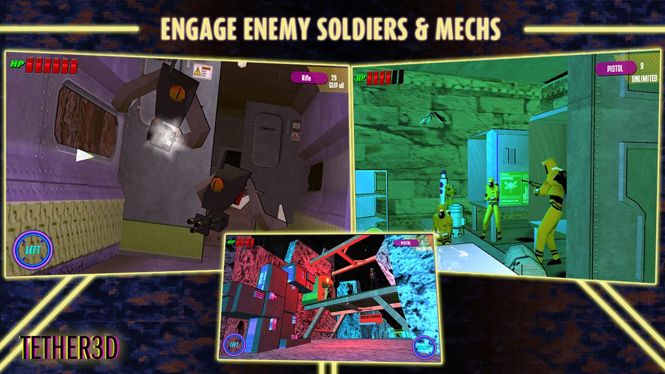TETHER 3D é um atirador de trilhos de ficção científica de ritmo médio com um sistema de capa em primeira pessoa. A história é essencial para o jogo e, portanto, considera TETHER 3D um jogo de aventura primeiro, o shooter em segundo.