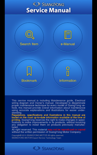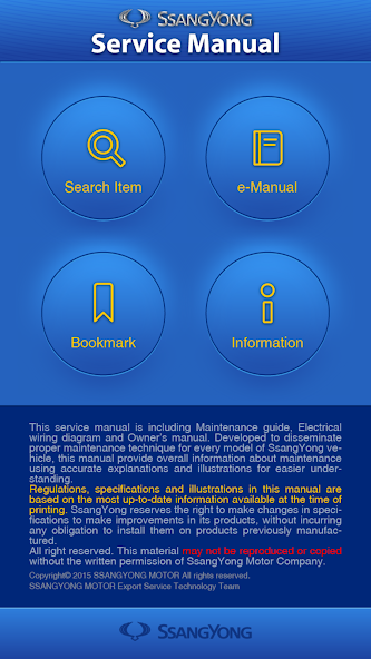 Это приложение было разработано для руководителей и сотрудников KG Mobility Company Service Network. Если у вас есть интерес к руководству по обслуживанию нашей компании, вы можете прочитать его через пункт «Свяжитесь с нами> A/S Руководство» на нашей домашней странице http: //www.kg-mobility .com.