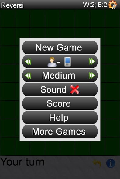 Игра играется, размещая пьесу (возможные ходы выделены на доске). Весь вражеский кусок между вашими существующими частями и вновь расположенным произведением (вертикально, горизонтально или диагонали) будет преобразована и станет вашим. Играя против телефона, вы всегда белый. Игра останавливается, когда не осталось ходов. Используйте меню, чтобы контролировать сложности, первым движением. Вы можете настроить игру, чтобы играть против телефона, другого человека или даже для того, чтобы играть в игру полностью.