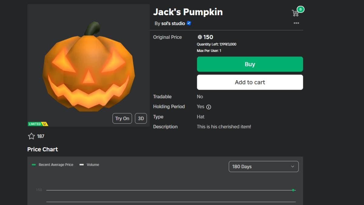 ด้วยคำอธิบาย“ นี่เป็นรายการที่เขารัก ” แจ็คฟักทองเป็นฟักทองแกะสลักขนาดใหญ่และสามารถซื้อได้จากตลาด Roblox สำหรับ 150 Robux มันจะมีค่าใช้จ่ายประมาณ $ 5-6 ถ้าคุณซื้อแพ็คที่ถูกที่สุดที่ให้ 500 Robux