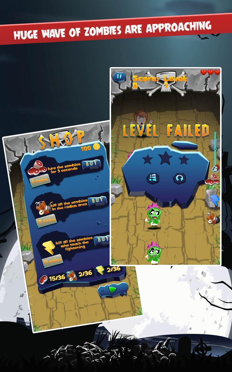 ฝูงชนของซอมบี้จะบุกเข้าหาคุณเพื่อข้ามเขตสีแดง ลองแตะหน้าจอจนกว่าคุณจะกำจัดสิ่งมีชีวิตนั้น
