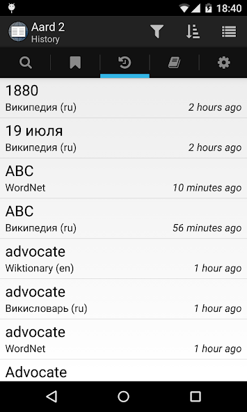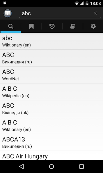 •在主活动中敲击应用程序徽标在活动词典中找到一个随机标题,并打开相应的文章。用户可以选择限制随机查找仅使用喜欢的字典。