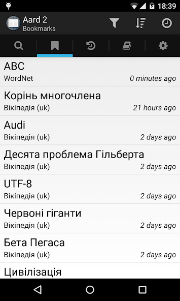 •访问的文章自动添加到历史记录中,并显示在历史标签中。文章也可以添加书签(查看文章时点击书签图标)。书签文章出现在书签标签中。书签和历史记录可以通过时间或文章标题进行过滤和排序。书签和历史记录都仅限于最近使用的100个物品。要删除书签或历史记录,请长时间点击列表项以输入选择模式,点击要删除的项目,点击垃圾桶可以图标并确认。查看文章时,也可以通过点击书签图标来删除书签。
