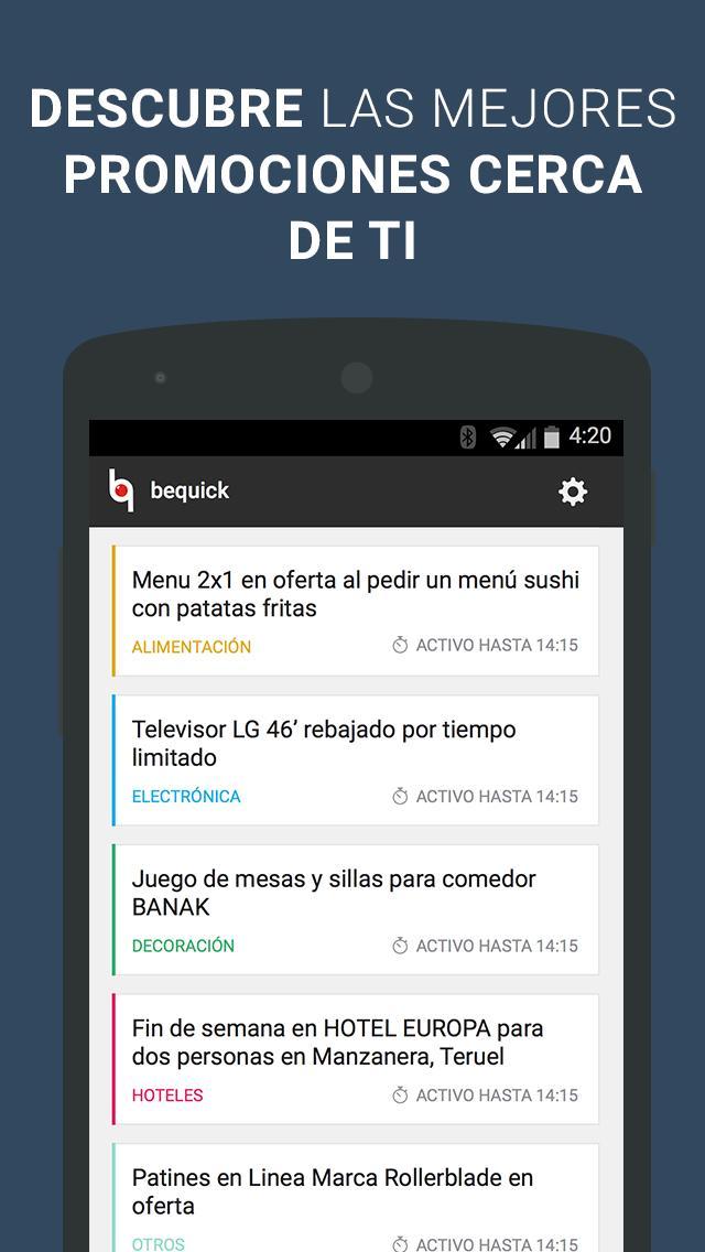 Bequick是Android(4.0或更高版本)的免费应用程序,可让您在靠近GPS位置的商店或机构上搜索并找到最佳折扣。目前,该应用程序包含Valencia,Alicante,Castellón和Murcia的Flash报价:光学,美发师,美容院,酒吧,休闲,餐馆,餐馆,儿科医生,时装商店和配饰,文具,书店,咖啡店,咖啡店,珠宝等等。