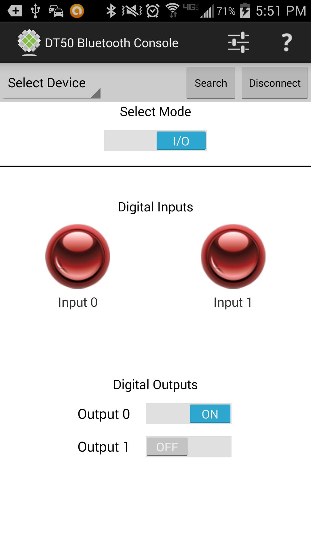 DT50模块可以选择包含数字和模拟I/O。 I/O可以通过蓝牙通信驱动I/O,从而使遥控器和远程数据收集应用程序成为可能。这些模块最多可以支持2个数字输入和2个数字输出,最多可支持4个模拟输入。数字I/O支持多达100mA电流和5-40VDC。这允许继电器,飞行员LED和切换应用。模拟I/O是0-5VDC标准和0-10V。
