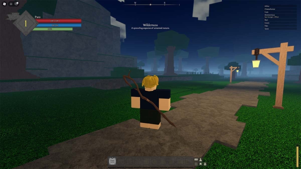 在您面前,将是老板Vangar产卵的小型绿色田地。我在上图中指出了此位置,但是这次NPC不在那里。如果您等待一段时间,他可能会自动出现,或者您只需切换服务器,直到您偶然发现他。 Vangar的头发有白色的头发,每只手拿着两把剑。击败他的机会很小,可以放下技能书:双武器,因此,在获得这种能力之前,您可能必须几次挑战这个老板。