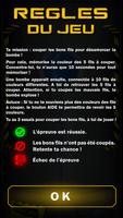 - 对于您的第一个任务,您需要记住5条颜色线。然后有必要在10条线中找到它们并切割它们!您有3次试验!帮助按钮使您可以查看几秒钟的颜色。如果您失败了,炸弹会爆炸!