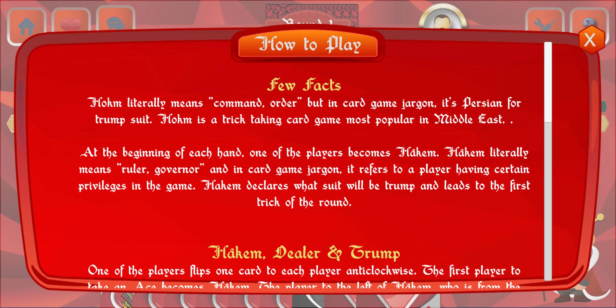 霍克(Hokm)是一款优雅的波斯技巧扑克牌游戏,但我们已经以现代风格设计了它,并且与法院作品非常相似。