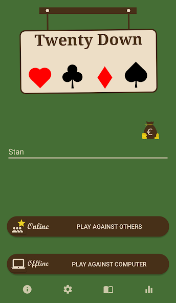 Twenty Down纸牌游戏播放,其中包括一套/双重的法国或巴伐利亚卡。每个玩家以20分的速度开始比赛,一位球员达到甚至降低了0分,它就会结束。首先达到0的球员,赢得了比赛。因此,每个技巧都很重要。如果心脏被确定为特朗普,那么每个技巧都会算出两点。