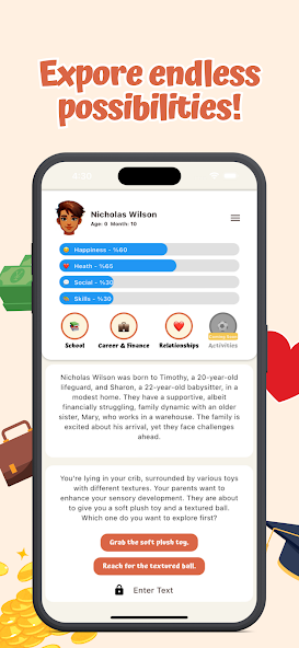 發現一個世界,您做出的每一個選擇都會使您的命運形狀!我們的AI驅動生活模擬遊戲將帶您從嬰儿期到高年級的旅程。每個生活階段都提供獨特的挑戰和機遇,讓您決定故事的發展方式。